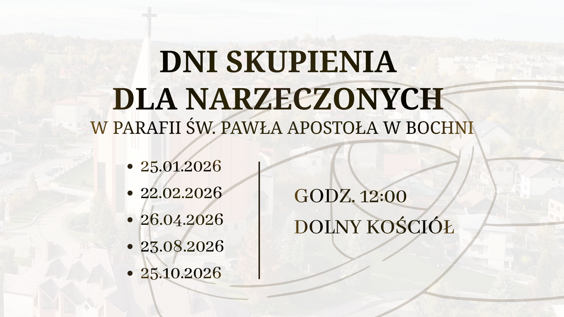 ZAPISY NA DNI SKUPIENIA DLA NARZECZONYCH PROSIMY DOKONYWAĆ POD NUMEREM TELEFONU 14 612 42 65 LUB W KANCELARII PARAFII ŚWIĘTEGO PAWŁA APOSTOŁA W BOCHNI DO GODZINY 18.00 W PIĄTEK PRZED PLANOWANYM NIEDZIELNYM DNIEM SKUPIENIA.