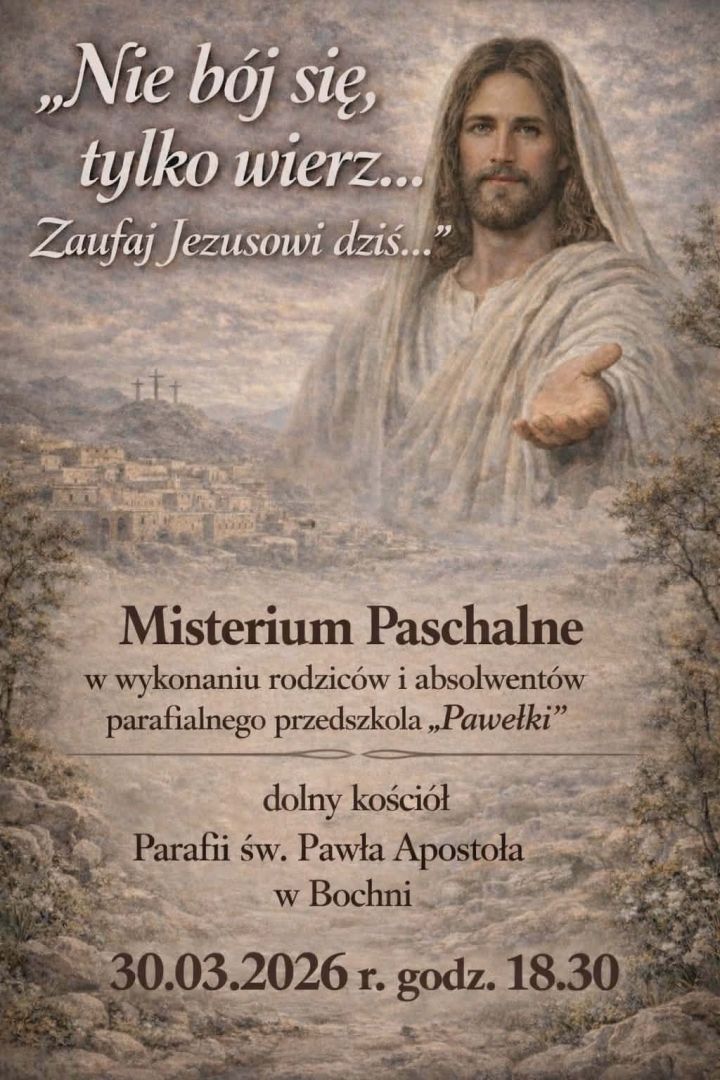 Serdecznie zapraszamy na Misterium Paschalne, które odbędzie się w Wielki Poniedziałek o godz. 18:30 w dolnym kościele. To wyjątkowe wydarzenie będzie pięknym wprowadzeniem w głębokie